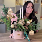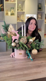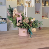 Beautiful holiday arrangement featuring Christmas decorations and long-lasting greens, perfect for bringing warmth and festive charm to any space. Accentuate your seasonal decor with our Holiday Wreaths or complement your setup with the Holiday White Christmas Tree for a classic and elegant festive touch.