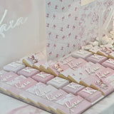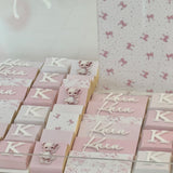 40 premium chocolates with fully personalized wrappers and decorative accents (names, initials, and tiny teddy bears).