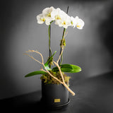 An elevated version of our classic orchid, Twin Orchid features two blooming Phalaenopsis stems for extra fullness and elegance. Arranged in a matte black pot with artistic driftwood and moss detailing, it’s an ideal centerpiece or refined décor gift.