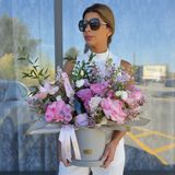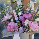 This magnificent arrangement features a lush blend of hydrangeas, romantic garden roses, and delicate seasonal blooms in a sophisticated palette of soft lilacs, lavenders, and radiant pinks. Nestled within the blooms is a bottle of the exquisite Rosé Mousseux from our partners at Agrovino, ready to be popped for a special toast.