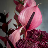Contents: A premium, seasonal mix including burgundy chrysanthemums, magenta anthuriums, cymbidium orchids, and other complementary blooms, paired with a 750ml bottle of Latourba Merlot red wine. Please note: flower selection is subject to seasonal availability to ensure the highest quality and freshness.